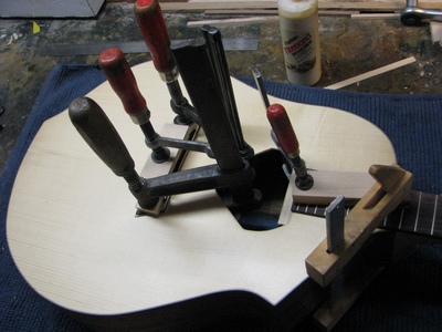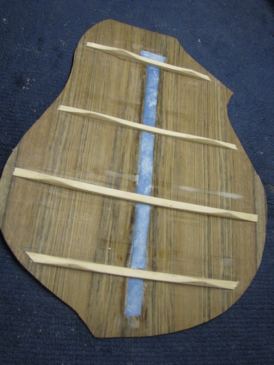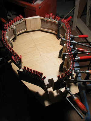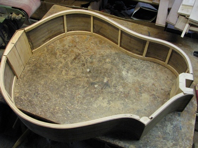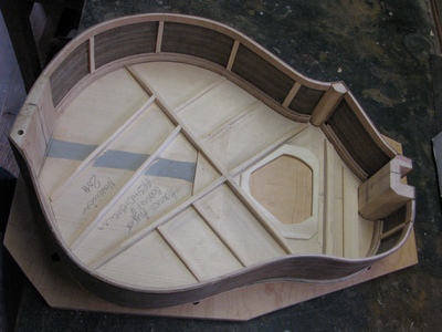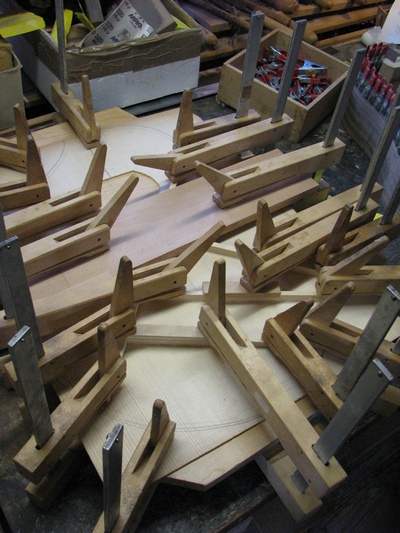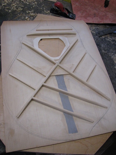 DER GITARRENBODEN.: ZUERST FLACHE FICHTENBALKEN AUFGELEIMT. DANACH EIN BESUCH IN DER GITARRENBAUWERKSTATT VON RAINER KALLENBACH*, EINEM EDELGITARRENBAUER "VOR DEM HERRN". DIESES GLÜCKLICHE ZUSAMMENTREFFEN MIT IHM GAB DEM WEITEREN GITARRENBAUVERLAUF DIE ENTSCHEIDENDE WENDE : BALKEN VOM BODEN WIEDER RUNTERGEHOBELT, POSITIONEN ETWAS VERÄNDERT UND DEN BODEN MIT GEWÖLBTEN BALKEN QUER VORGESPANNT. DER BODEN WURDE UM EINIGES DÜNNER AUSGESCHLIFFEN, EBENSO DIE DECKE.