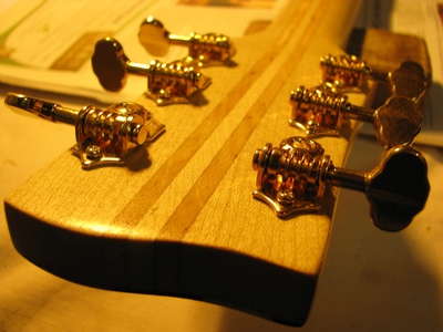 IM OBERKLOTZ VERLEIMT. AUSGIEBIGE ANPASSUNGSARBEITEN GINGEN DIESEM VORGANG VORAUS (SCHWITZ!) EBENSO DER SAITENHALTER. DAS PALISANDERGRIFFBRETT WAR CNC VORGESÄGT. TYP: FINGERBOARD, 64,8 CM SCALE, FENDER, RADIUS: 12" DIE BÜNDE WURDEN SELBST EINGESCHLAGEN. |